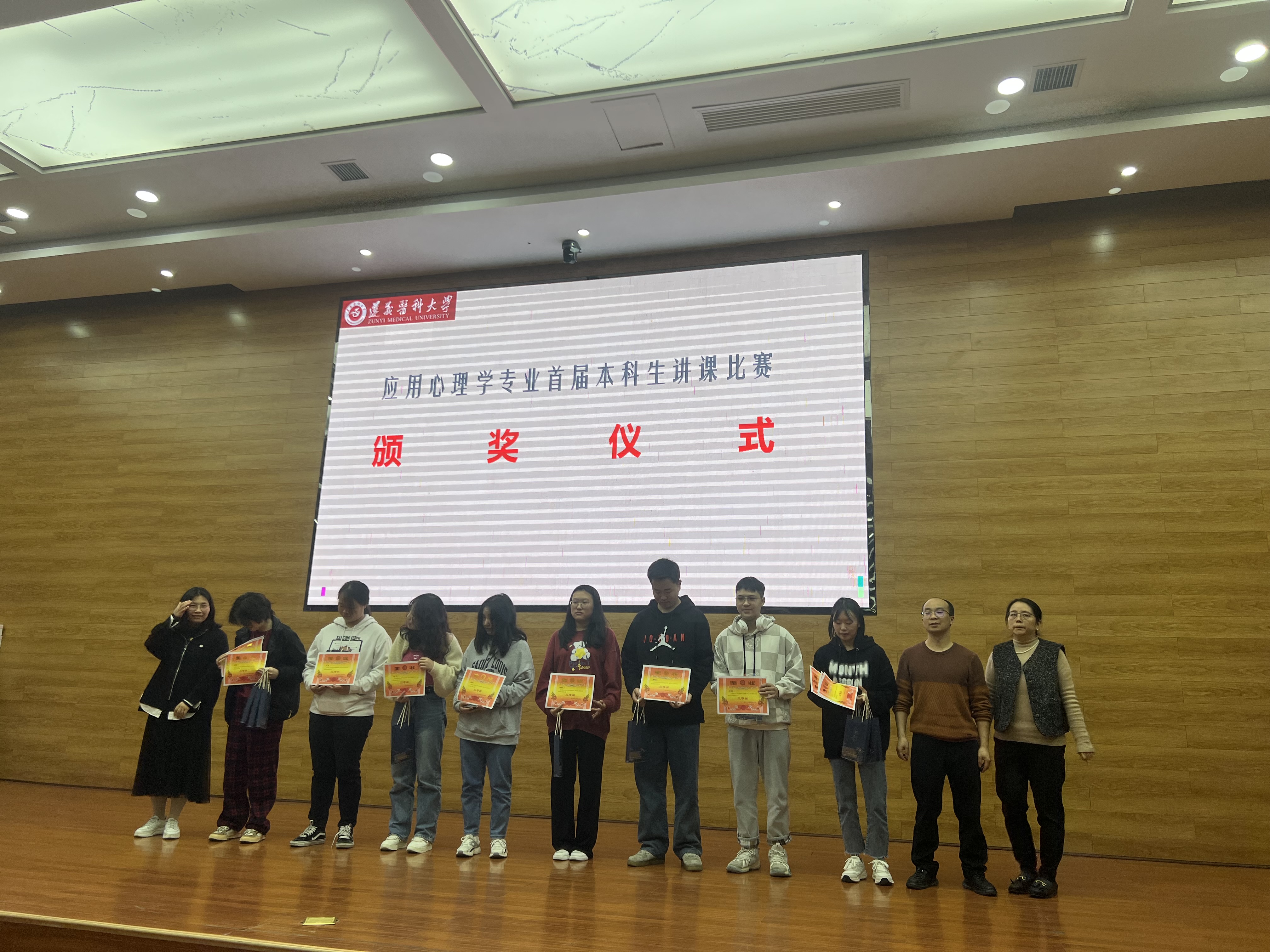 在热烈的气氛中,专业老师为获得应用心理学专业首届本科生讲课比赛的30名专业同学举行了颁奖仪式。其中,获得一等奖共6名(李啟叶等)、获二等奖共6名(黄春辉等)、获三等奖共12名(李青青等)、获优秀奖6名(王桃红等)。